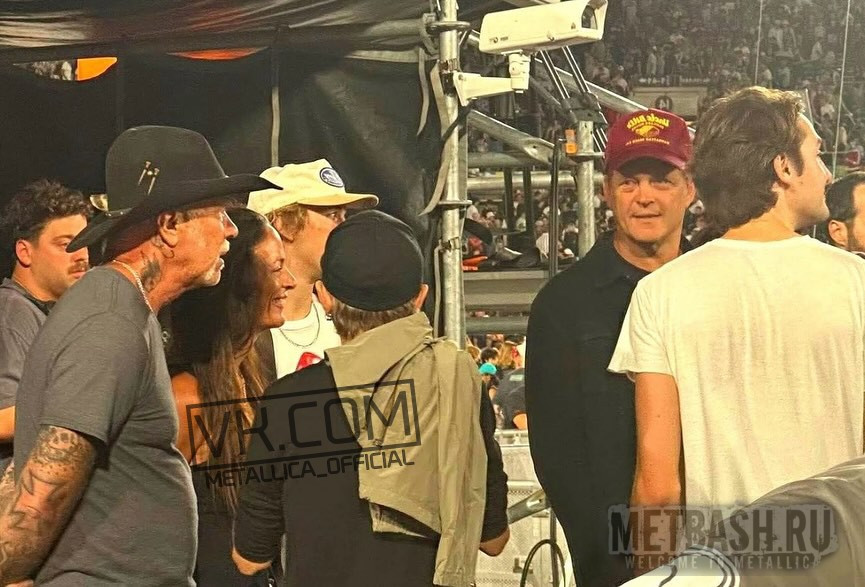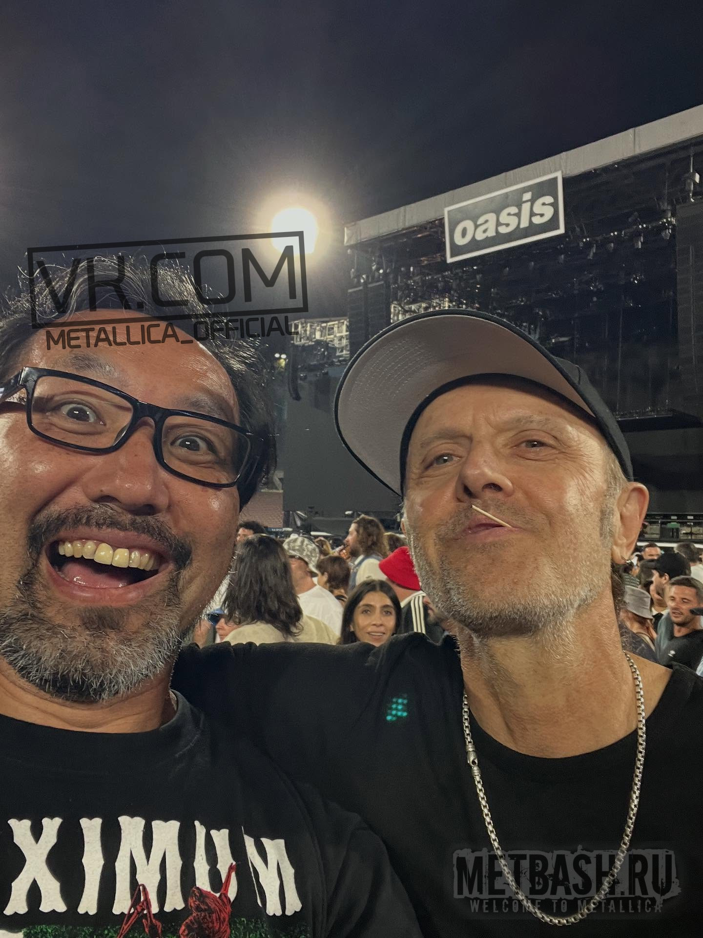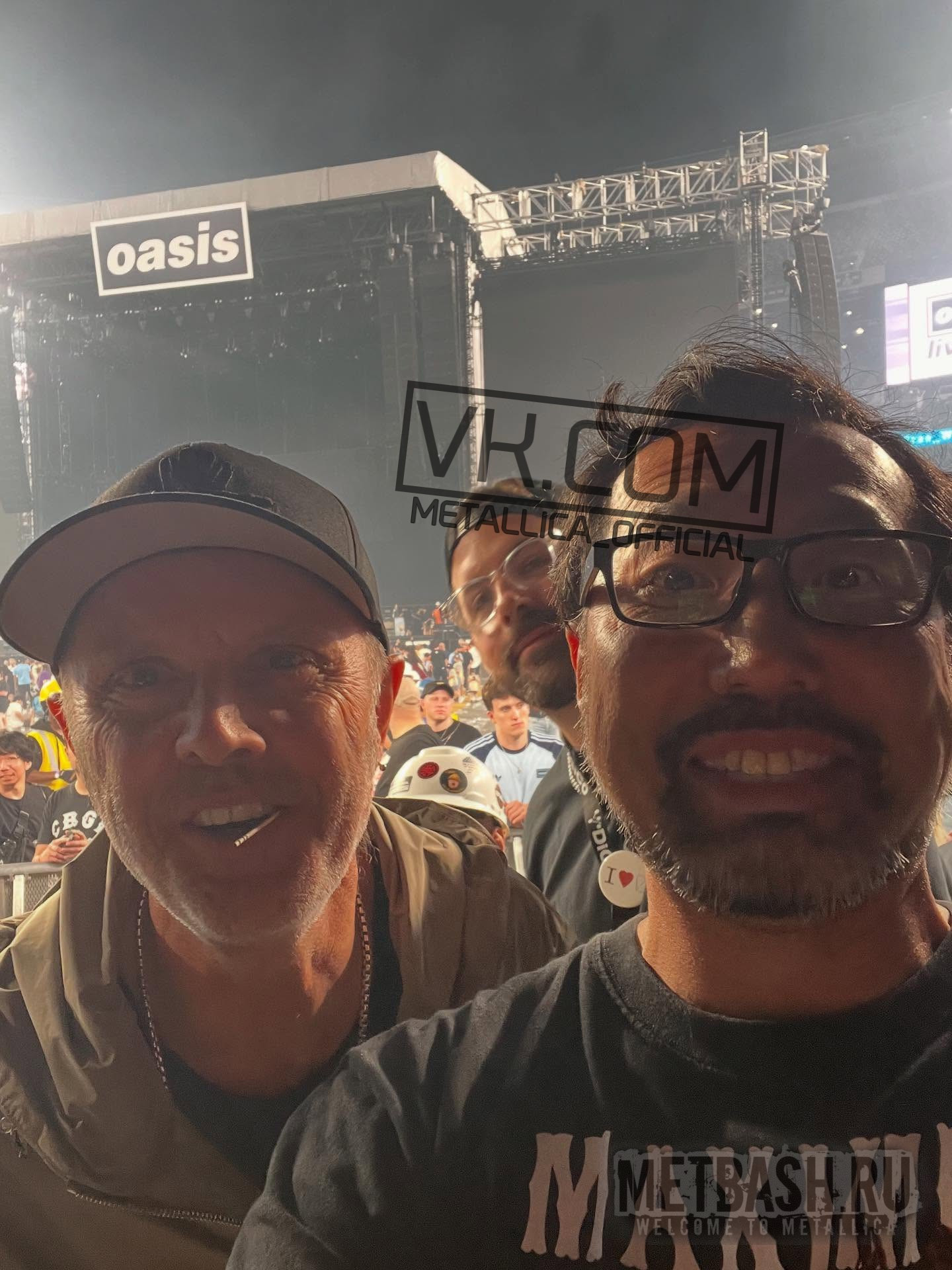 07 сентября в Пасадине, штат Калифорния, на стадионе “Rose Bowl” состоялся концерт Oasis. То, что на нём был Ларс Ульрих (Lars Ulrich) никого не должно удивлять. Одна из его самых любимых групп. В перерывах между подготовками к выступлению на “Back To the Beginning” в Бирмингеме в июле этого Ларс уже мотался на все британские концерты воссоединившихся братьев Галлахеров. Но вот как он затащил на конц в Калифорнии Джеймса Хэтфилда (James Hetfield) - глубочайшая загадка. Или это была Адриана (Adriana Gillett)? Этого мы не узнаем.