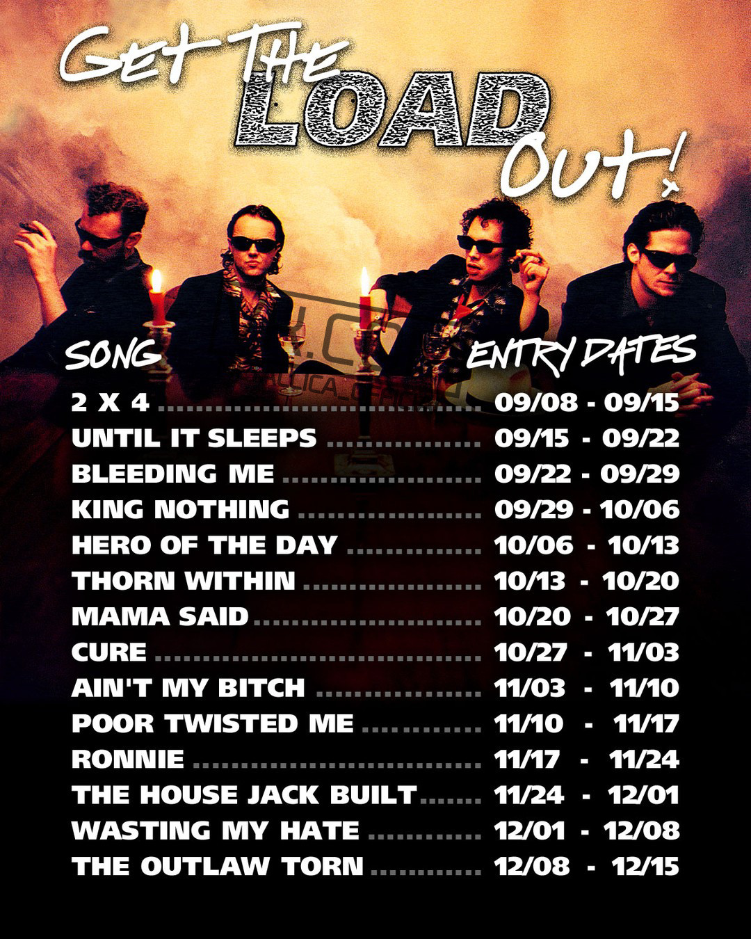 Мы хотим увидеть ваши лучшие и самые мрачные кавер-версии треков с альбома “Load”! Зажигайте на любом инструменте по вашему выбору. В течение следующих 14 недель у вас будет возможность отправить свой кавер на определённый трек. Мы начинаем конкурс с песни «2 x 4» в понедельник, 8 сентября. Полный список заявок смотрите на изображении выше.