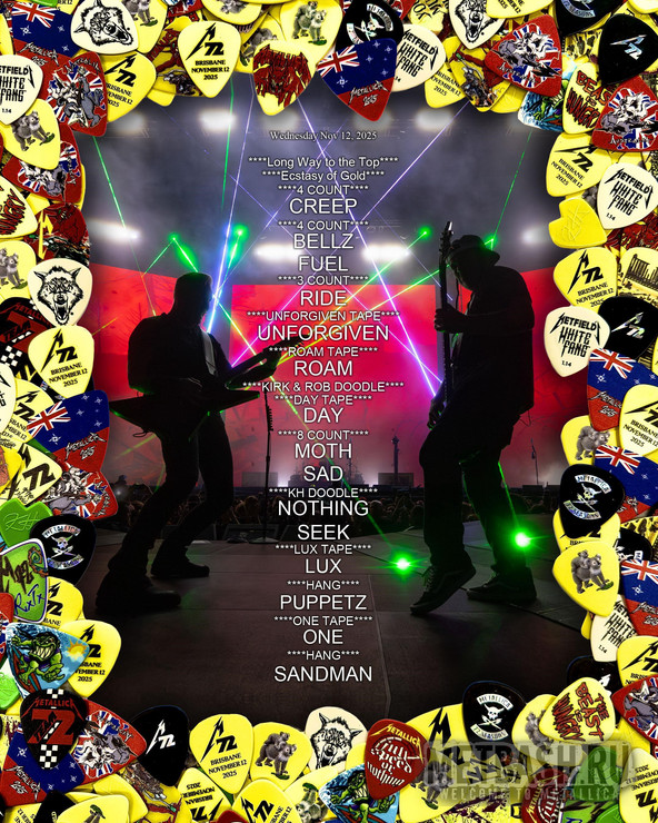 15 песен сет-листа Metallica по альбомам: “Metallica” / “Чёрный альбом” (5 песен), “Ride the Lightning” (3 песни), “…And Justice for All” (1 песня), “72 Seasons” (1 песня), “Death Magnetic” (1 песня), “Hardwired… to Self‐Destruct” (1 песня), “Kill ’Em All” (1 песня), “Master of Puppets” (1 песня) и “Reload” (1 песня).