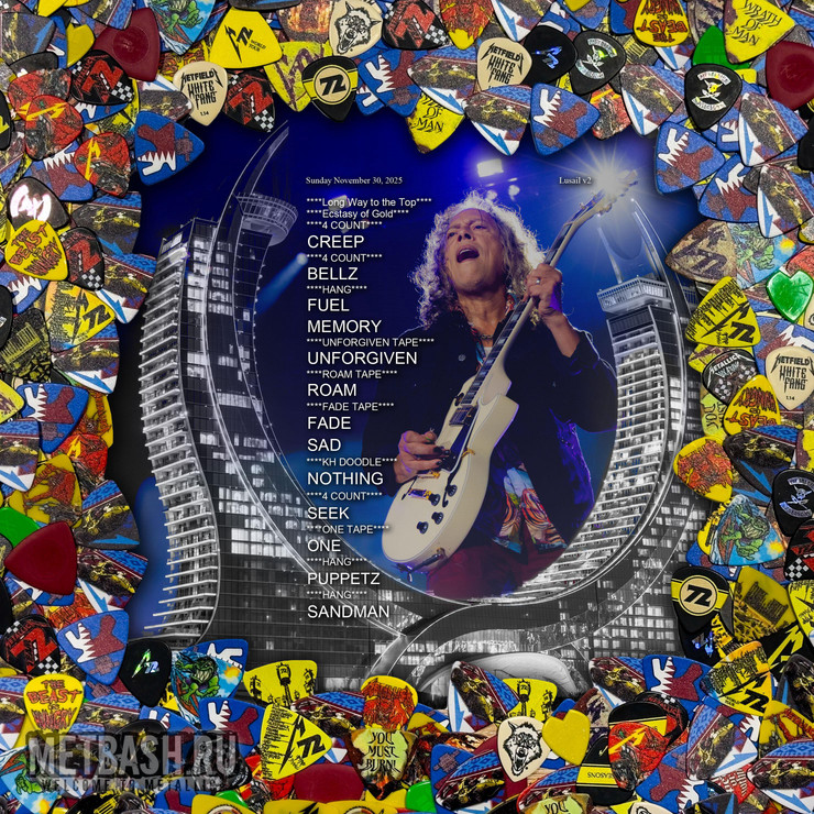 Плавно возвращаемся к концертам Металлики конца 2025 года. У нас осталась буквально парочка выступлений на Ближнем Востоке в конце ноября / начале декабря. 30 ноября Metallica впервые в своей истории посетили с концертом государство Катар. Концерт из 13 песен в столице Дохе прошёл в рамках афтепати катарского гран-при “Формулы-1″.